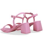 Sandália em couro atanado napoli rosa. De salto geométrico alto. Traseiro aberto com tira ajustável e fivela de metal dourada. Gáspea em tiras finas.