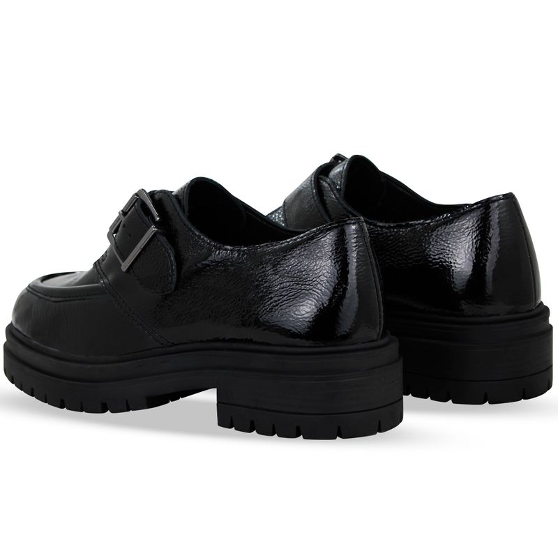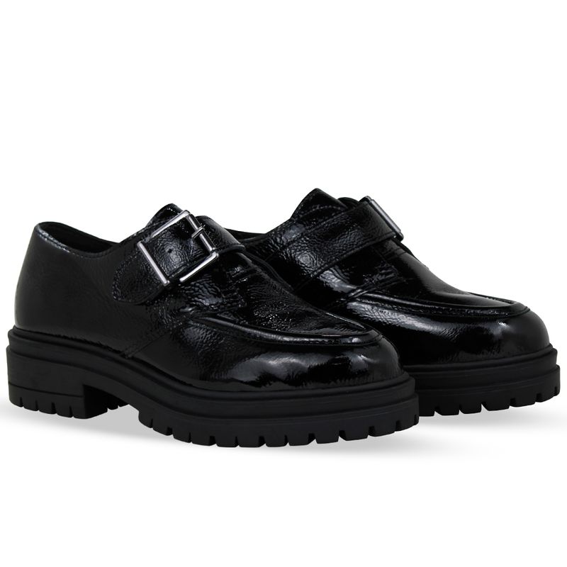 Sapato em couro verniz preto. De solado tratorado e bico redondo. Fechamento com fivela de metal onix.
