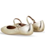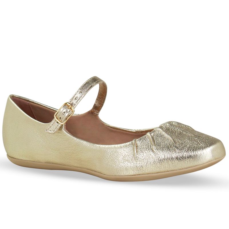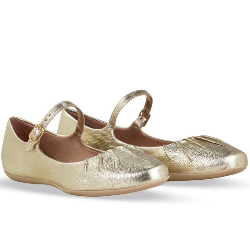 Sapatilha em couro metalizado roma dourado. De solado rasteiro e bico redondo. Possui tira fina ajustável sobre o pé e fechamento em fivela de metal dourada. Detalhe em rugas na gáspea do modelo.