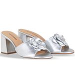 Tamanco em couro metalizado roma prata. De salto bloco alto encapado na cor prata. Gáspea larga com abertura frontal e enfeite de flor sobre o pé.
