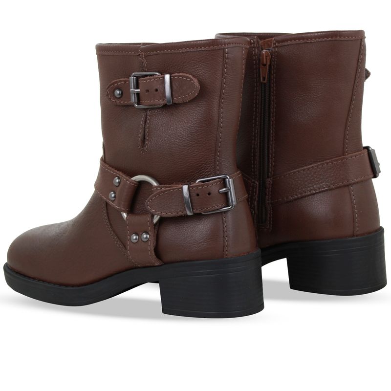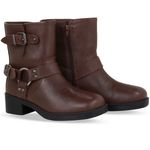 Bota Biker Bottero de cano baixo em couro burnish wood. De salto baixo e bico quadrado. Possui fechamento em zíper na lateral interna e detalhes em metal onix na lateral externa.
