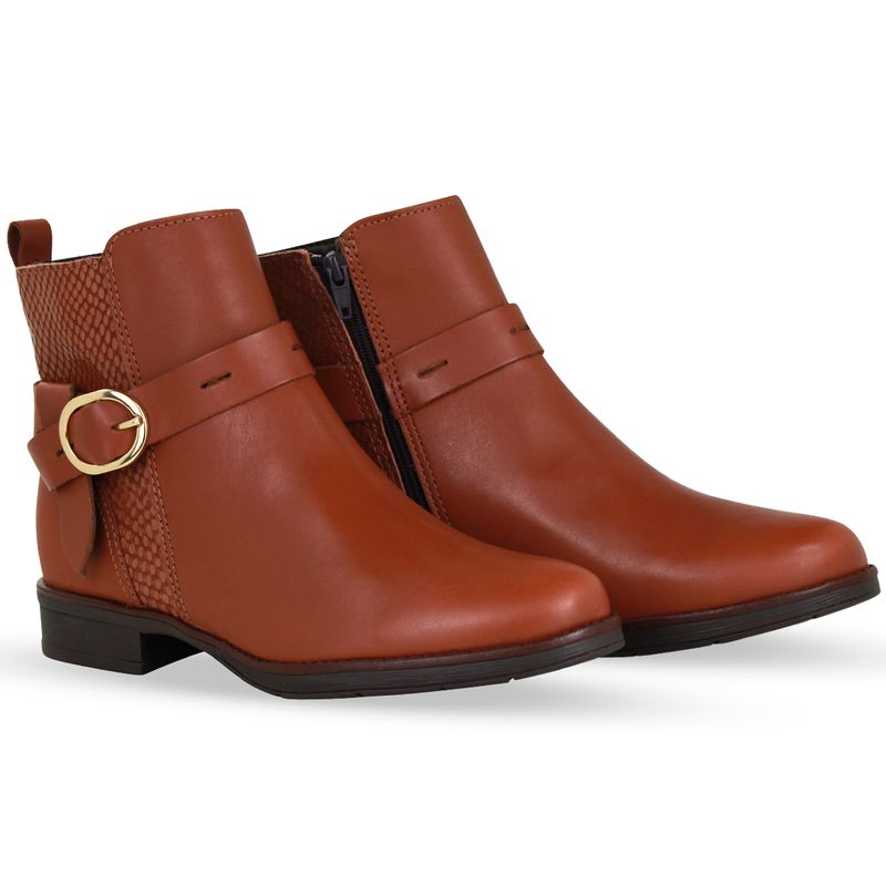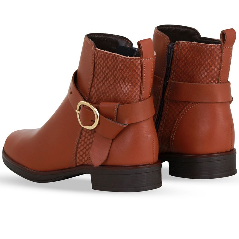 Bota cano baixo em couro atanado napoli conhaque. De solado rasteiro e bico redondo. Possui detalhe em couro snake no traseiro e fivela de metal onix. Com zíper na lateral interna, facilitando o calce.