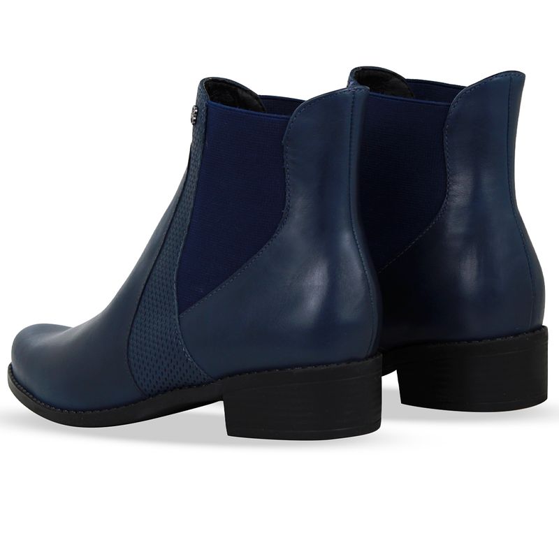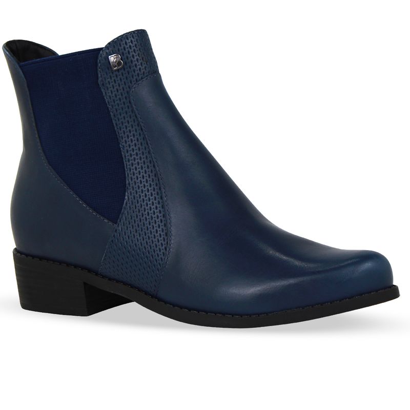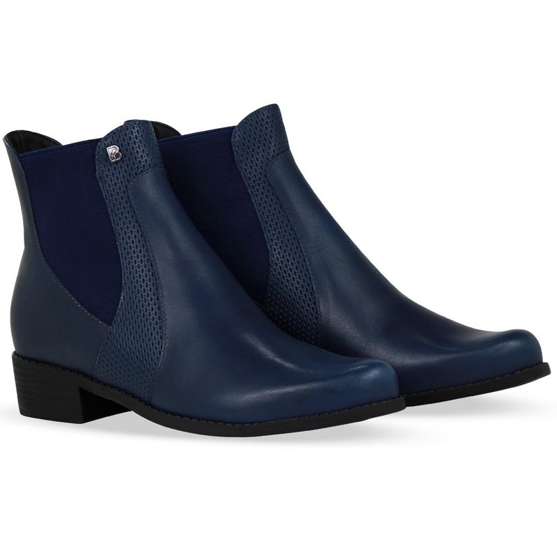Bota cano baixo em couro atanado napoli marinho. De salto baixo e bico fino. Possui elásticos nas laterais que facilitam o calce e detalhe em couro veneza.