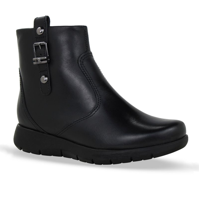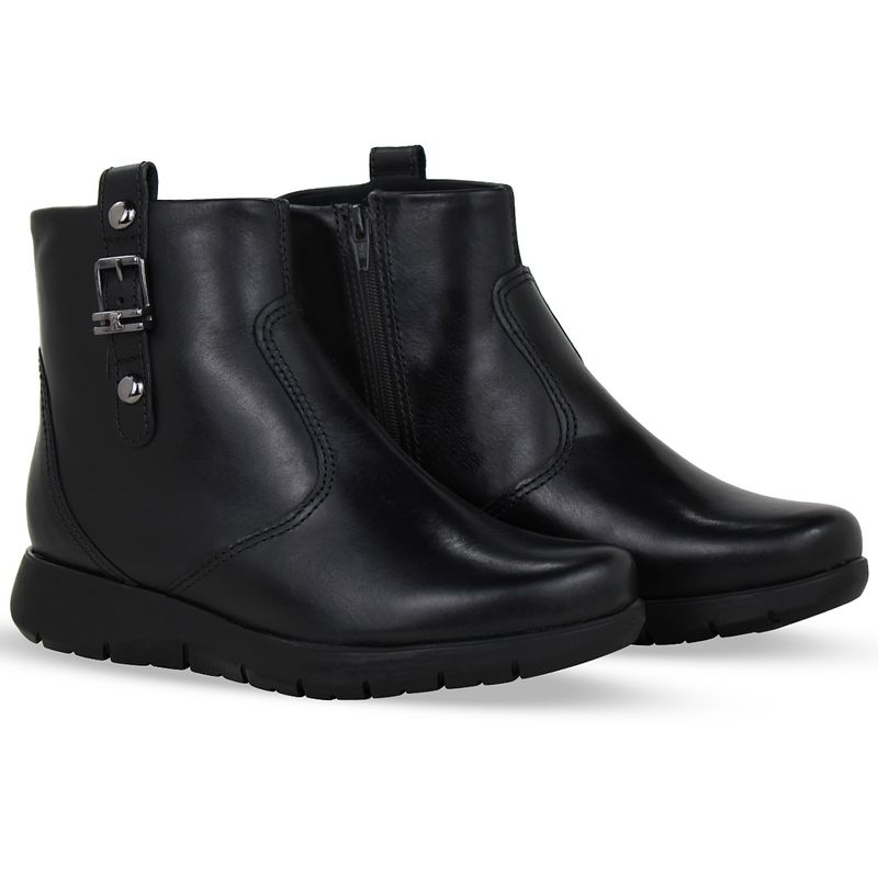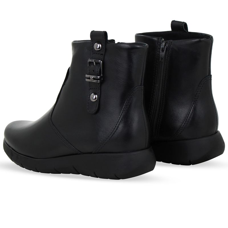 Bota cano baixo em couro atanado napoli preto. De solado rasteiro e bico redondo. Possui detalhe em couro veneza, detalhe em metal onix e zíper na lateral interna, facilitando o calce.