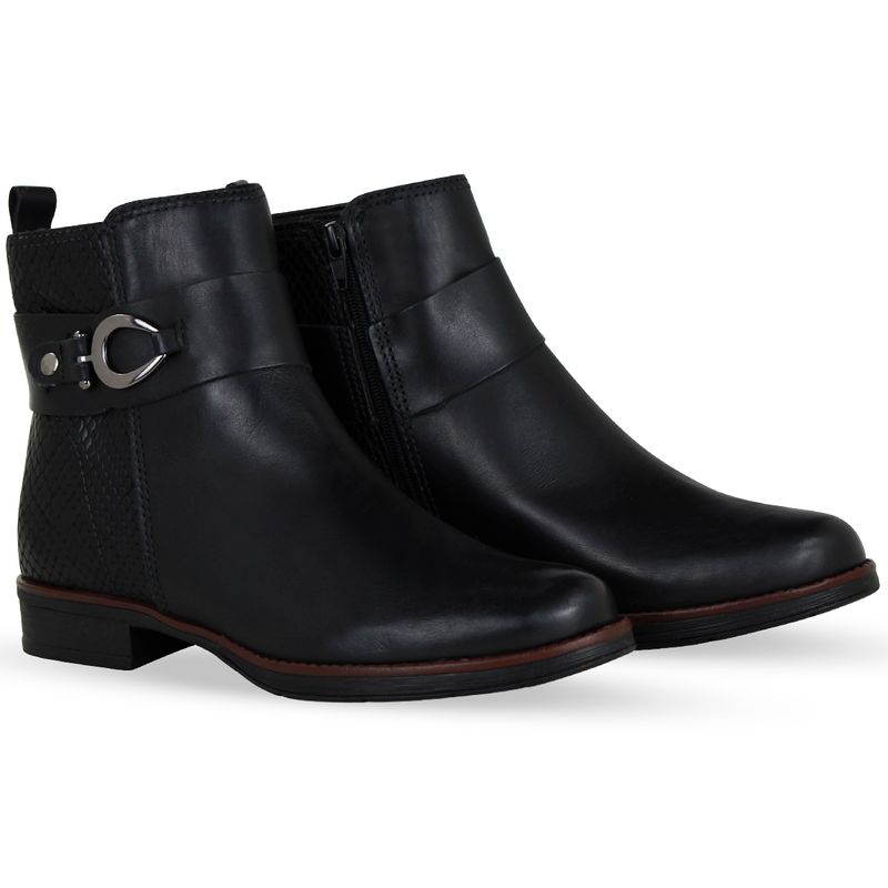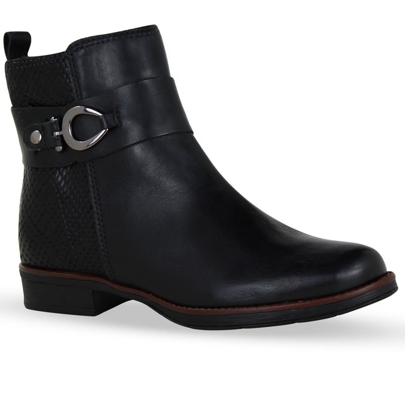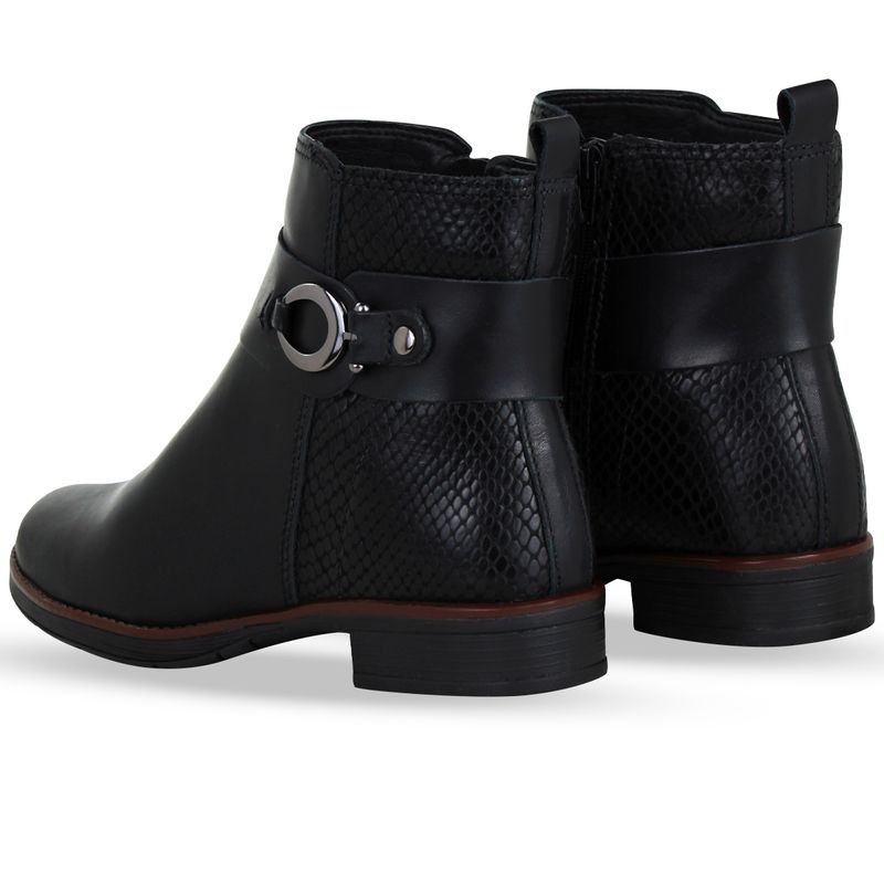 Bota cano baixo em couro atanado napoli preto. De solado rasteiro e bico redondo. Possui detalhe em couro snake no traseiro e fivela de metal onix. Com zíper na lateral interna, facilitando o calce.