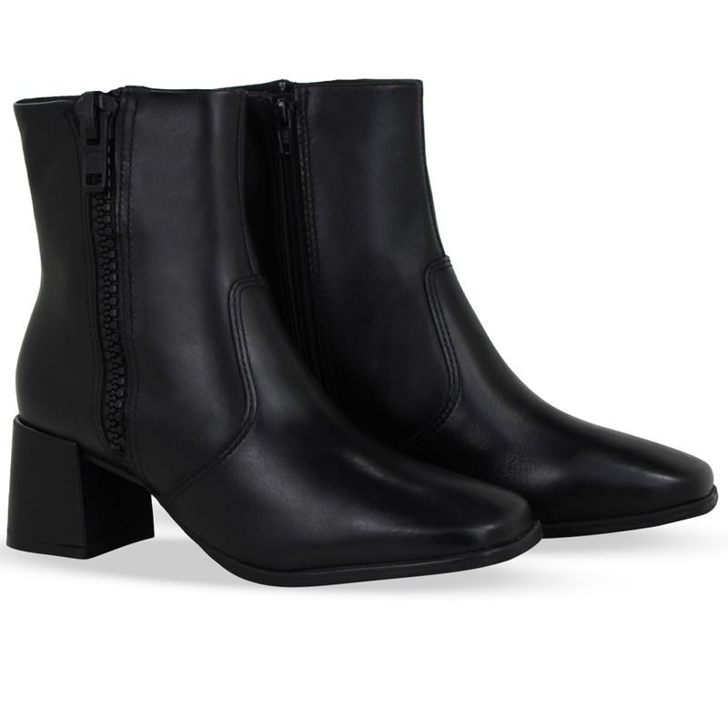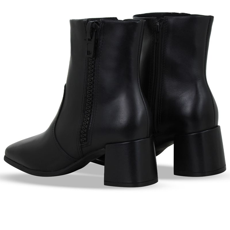 Bota cano baixo em couro atanado napoli preto. De salto bloco alto e bico quadrado. Possui fechamento em zíper na lateral interna e zíper falso na parte externa.