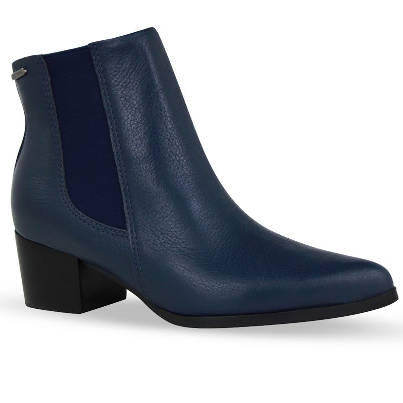 Bota cano baixo em couro burnish marinho. De salto baixo e bico fino. Possui zíper na lateral interna e elástico na lateral externa, que facilita o calce.