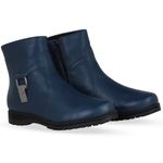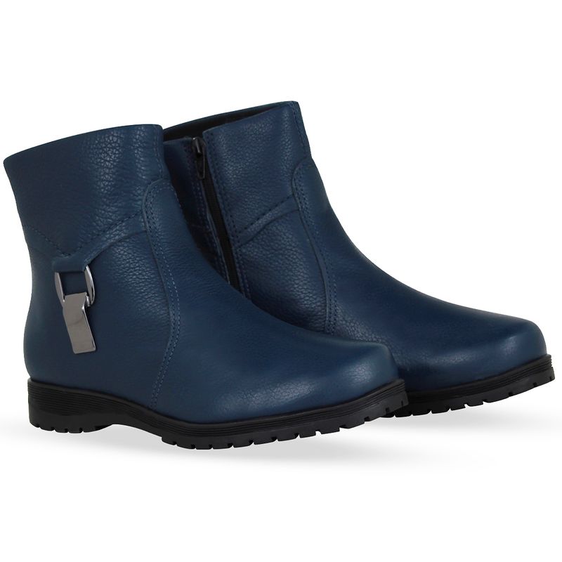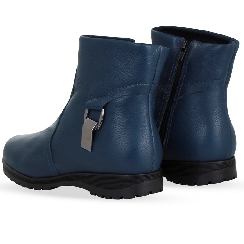 Bota cano baixo em couro burnish marinho. De solado rasteiro e bico redondo. Possui zíper na lateral interna, facilitando o calce. Detalhes em metal onix na lateral externa, trazendo charme e estilo ao modelo.