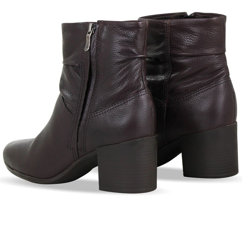 Bota de cano baixo em couro burnish marrom. De salto bloco médio e bico redondo. Possui zíper na lateral externa com puxador facilitando o calce. Detalhes em rugas no cano.