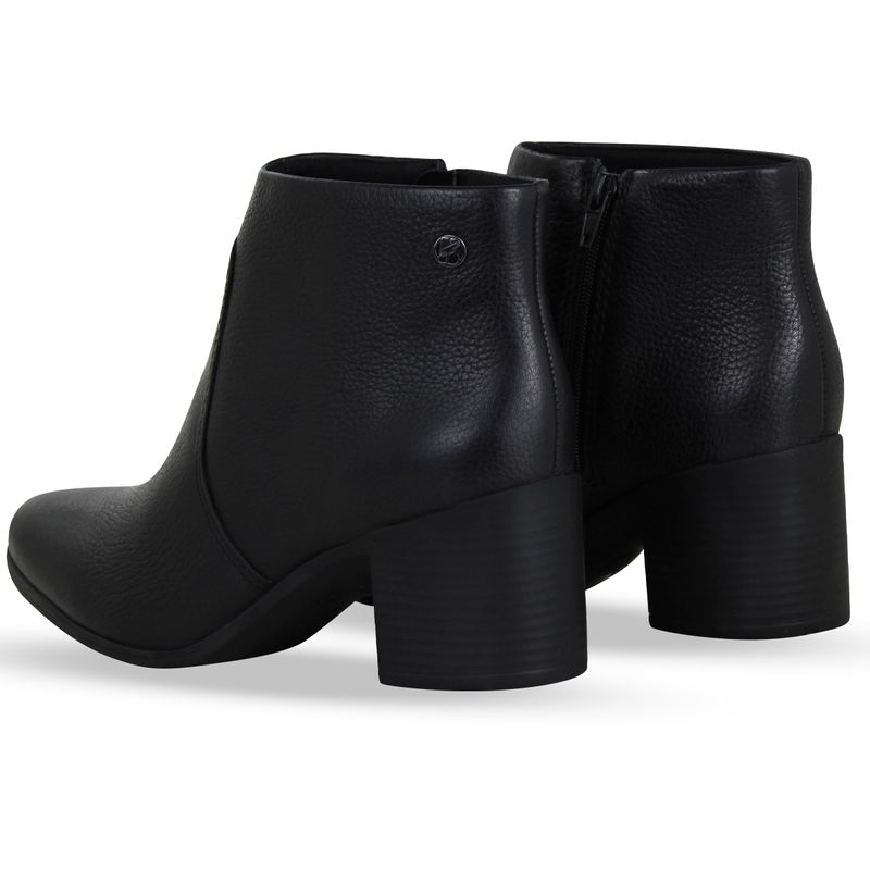 Bota cano baixo em couro burnish preto. Salto alto, bico arredondado e zíper na lateral interna do pé, facilitando o calce.