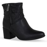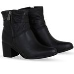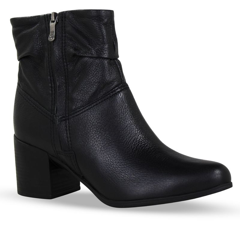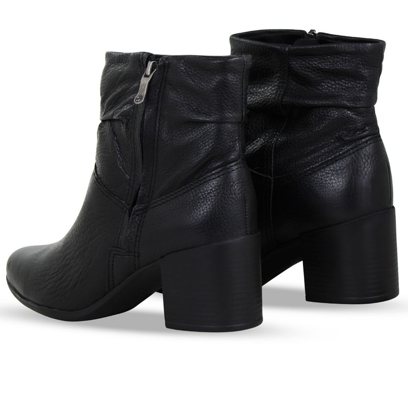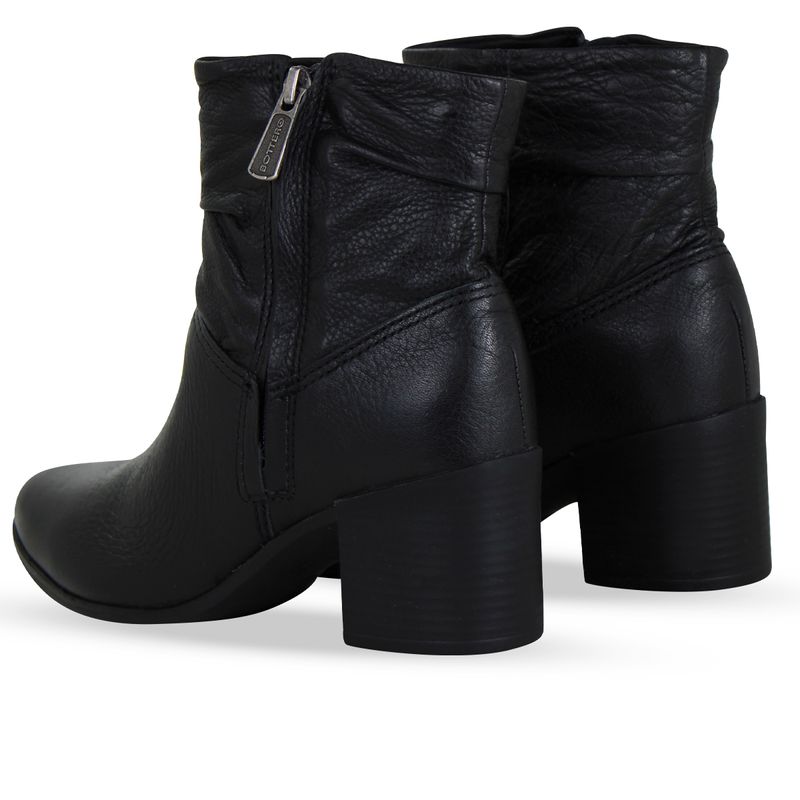Bota de cano baixo em couro burnish preto. De salto bloco médio e bico redondo. Possui zíper na lateral externa com puxador facilitando o calce. Detalhes em rugas no cano.