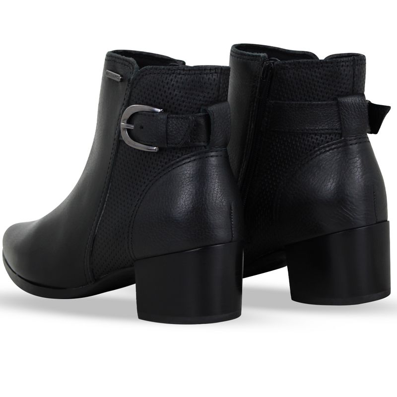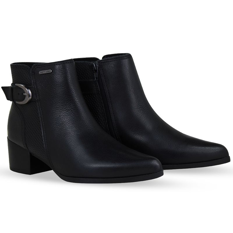 Bota de cano médio em couro burnish preto. De salto baixo e bico fino. Possui fechamento em zíper na lateral interna. Lateral com detalhe em couro veneza e metal onix.