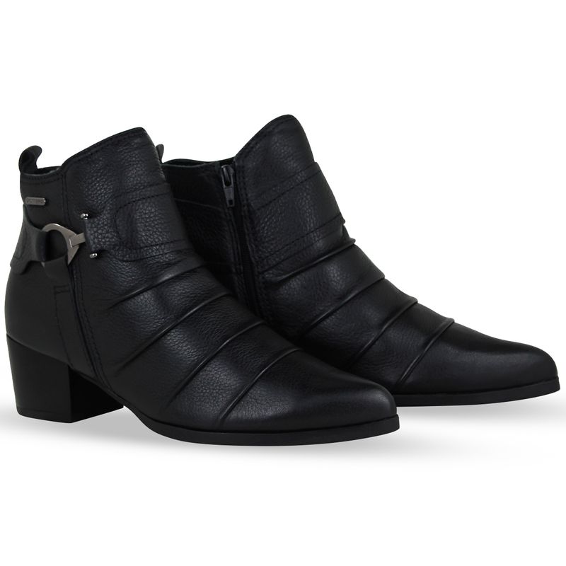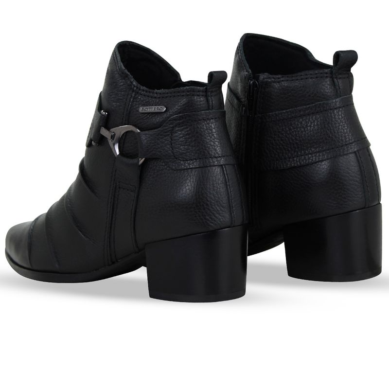 Bota de cano baixo em couro burnish preto. De salto baixo e bico fino. Possui zíper na lateral interna. Gáspea com detalhes em rugas e metal onix na lateral externa.