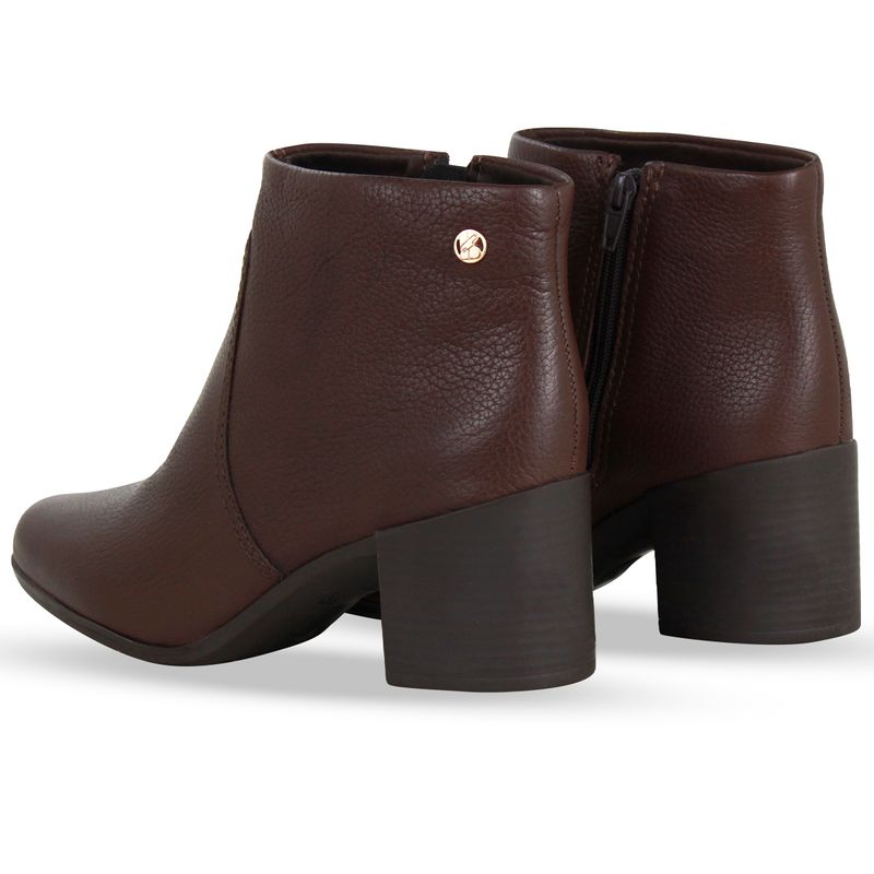 Bota cano baixo em couro burnish wood. Salto alto, bico arredondado e zíper na lateral interna do pé, facilitando o calce.