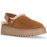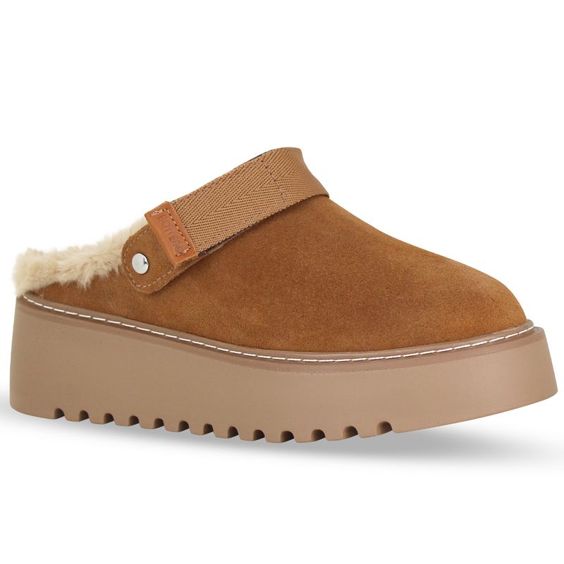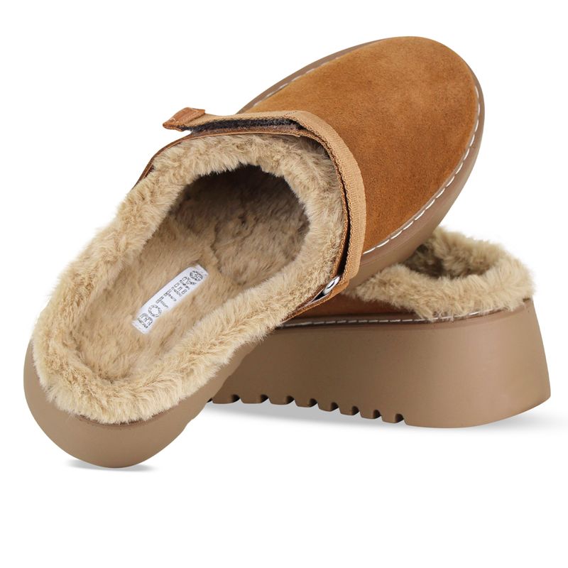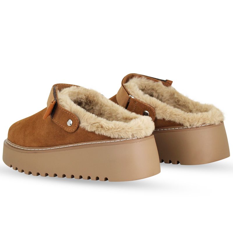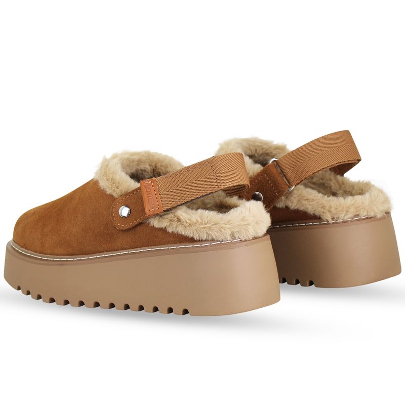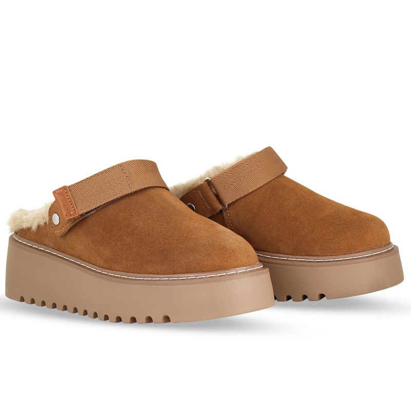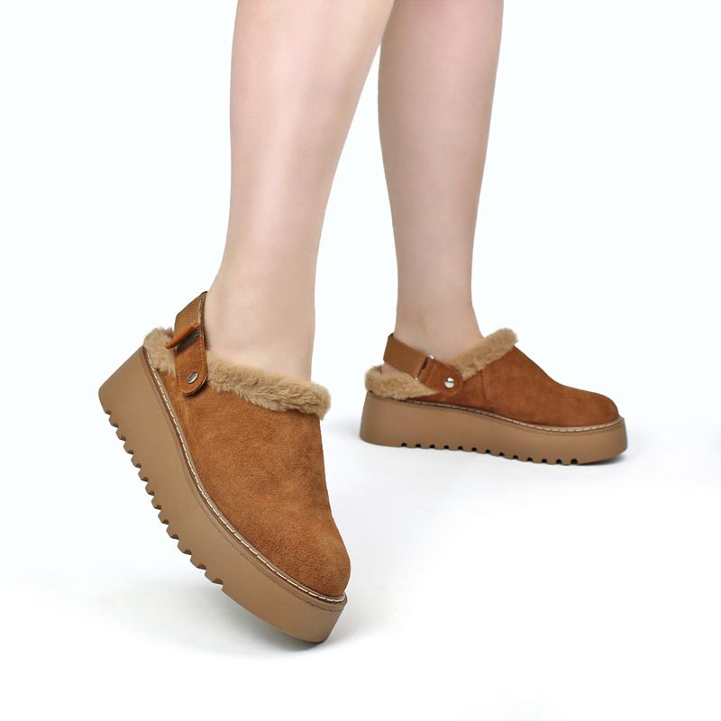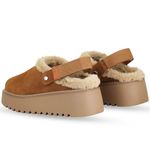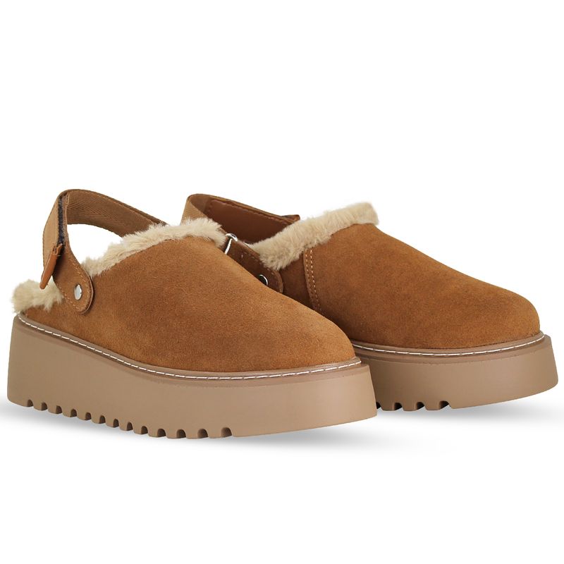 Bota cano baixo em couro camurça castanho. De solado tratorado e bico redondo. Possui pelos em todo o interior, incluindo a palmilha. Traseiro aberto com tira ajustável e velcro que possibita total firmeza ao pé.