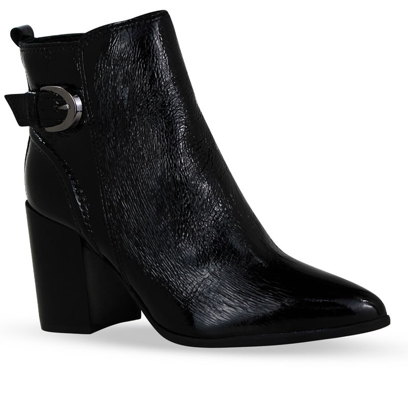Bota cano baixo em couro verniz show preto. De salto bloco alto e bico fino. Possui fechamento em zíper na lateral interna e fivela de metal onix na parte externa do pé.