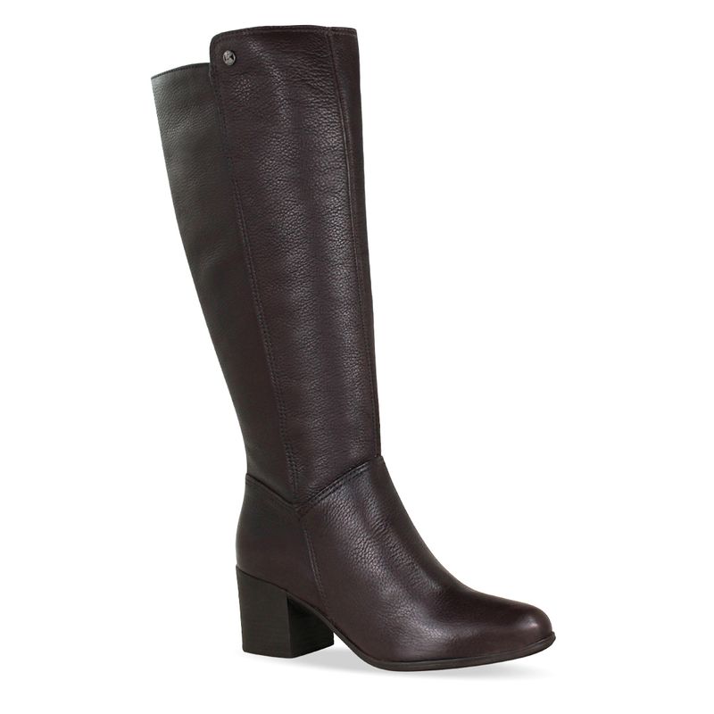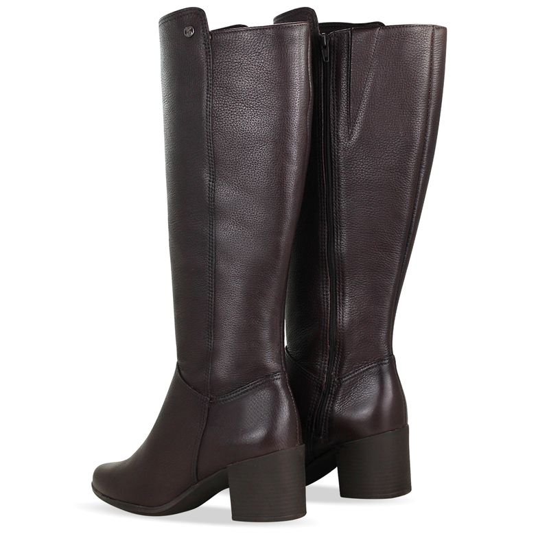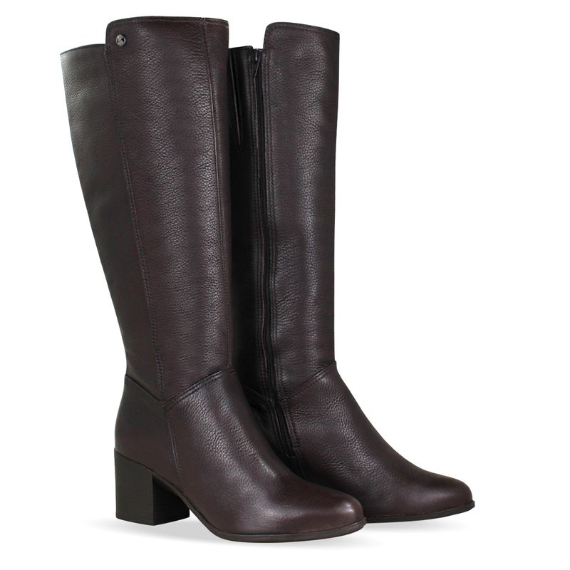 Bota de cano longo em couro burnish marrom. De salto médio com solado preto. Possui zíper em toda a lateral interna. Modelo resistente e confortável.