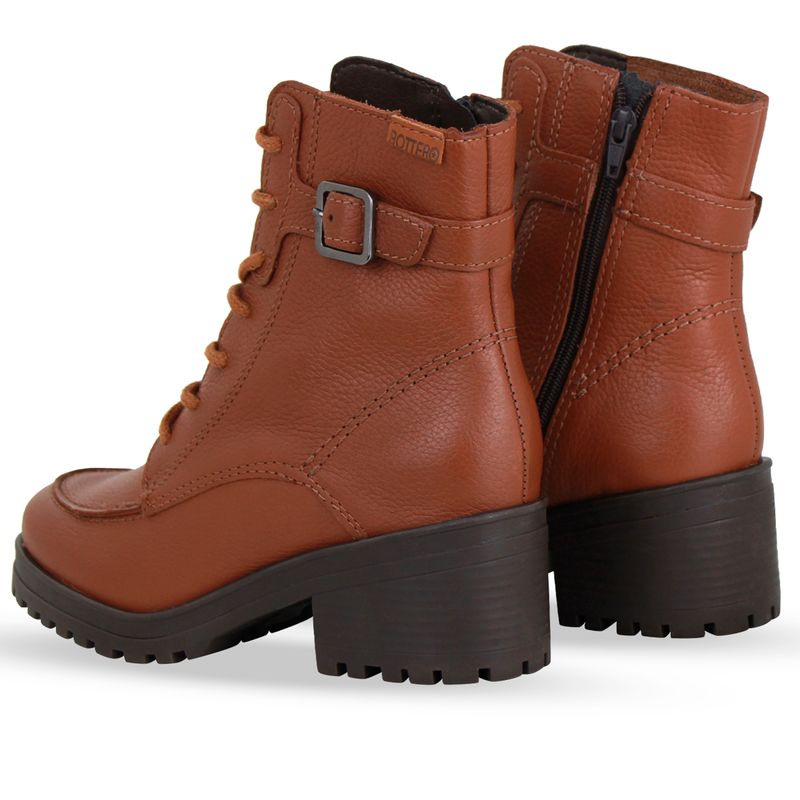 Bota coturno em couro burnish conhaque. De solado tratorado médio. Possui detalhes em costura grossa na gáspea e fivela de metal na lateral externa. Possui cadarços que possibilitam o ajuste e zíper na lateral interna que facilita o calce.
