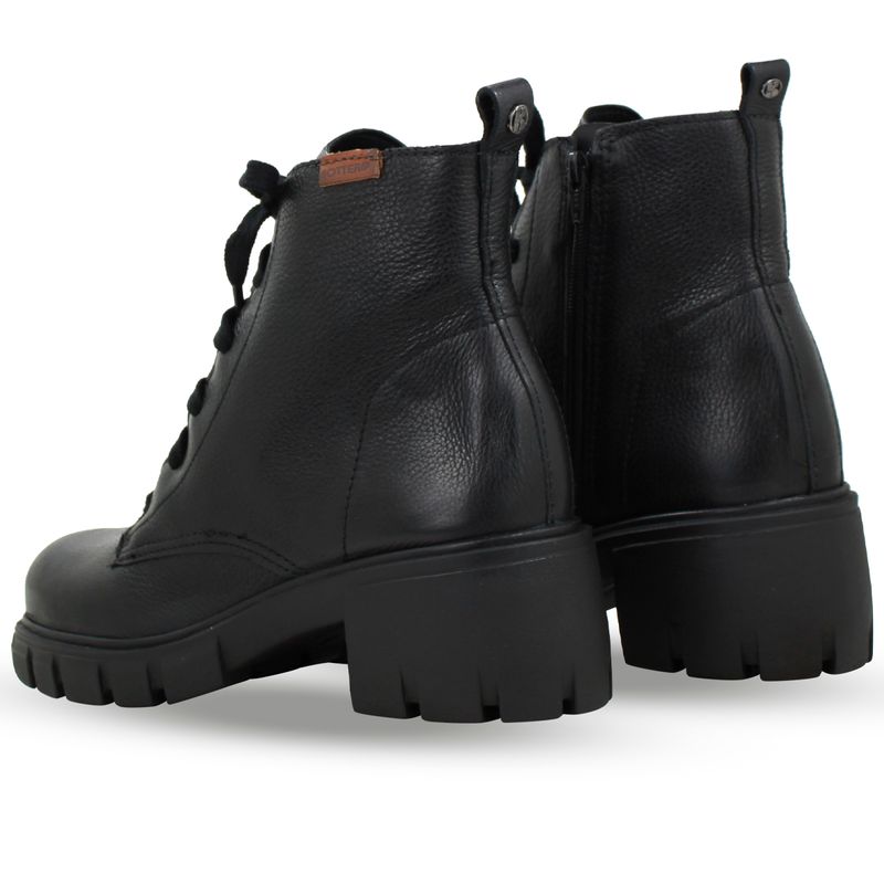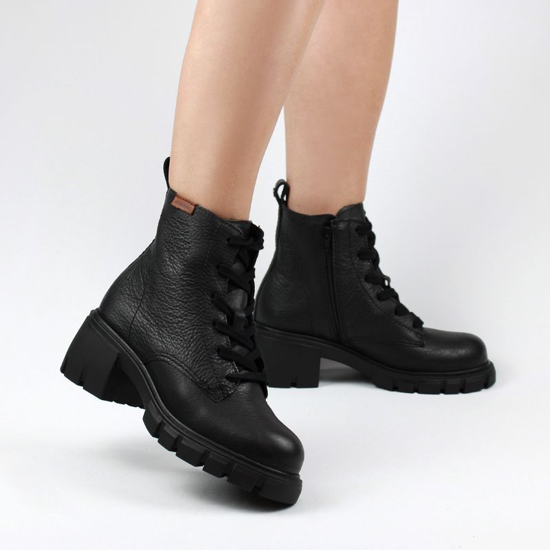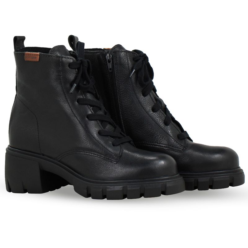 Bota corturno em couro burnish na cor preto. De salto tratorado médio. Possui fechamento em cadarços e puxador traseiro que proporciona um calce mais fácil.