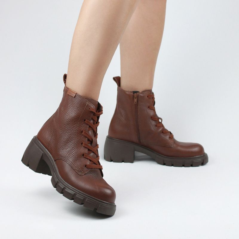 Bota corturno em couro burnish na cor wood. De salto tratorado médio. Possui fechamento em cadarços e puxador traseiro que proporciona um calce mais fácil.