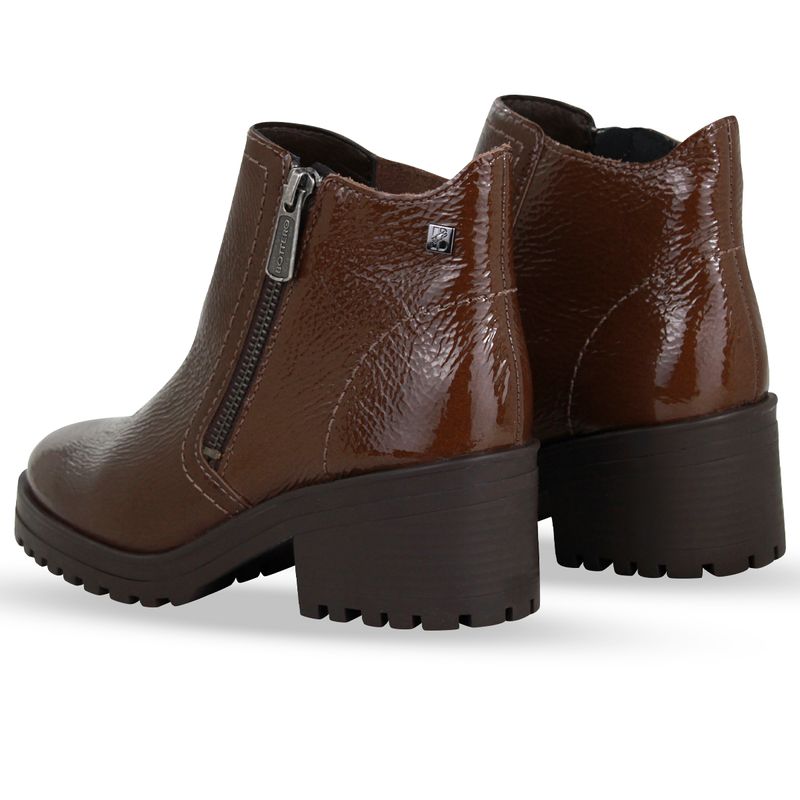 Bota coturno em couro verniz show capuccino. De solado tratorado médio e bico redondo. O modelo possui zíper na lateral externa com puxador de metal, facilitando o calce.