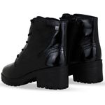 Bota coturno de couro verniz show preto. De solado tratorado médio e bico redondo. O modelo possui fechamento em cadarços que facilitam o ajuste e zíper interno para um calce mais fácil.