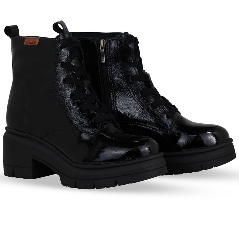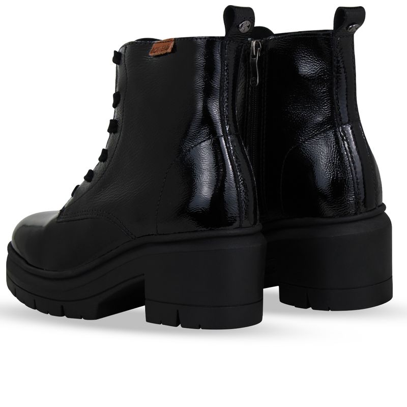 Bota coturno em couro verniz show preto. De salto tratorado alto e bico redondo. Possui zíper na lateral interna e fechamento em cadarços que facilitam o ajuste ao pé.