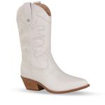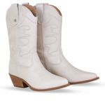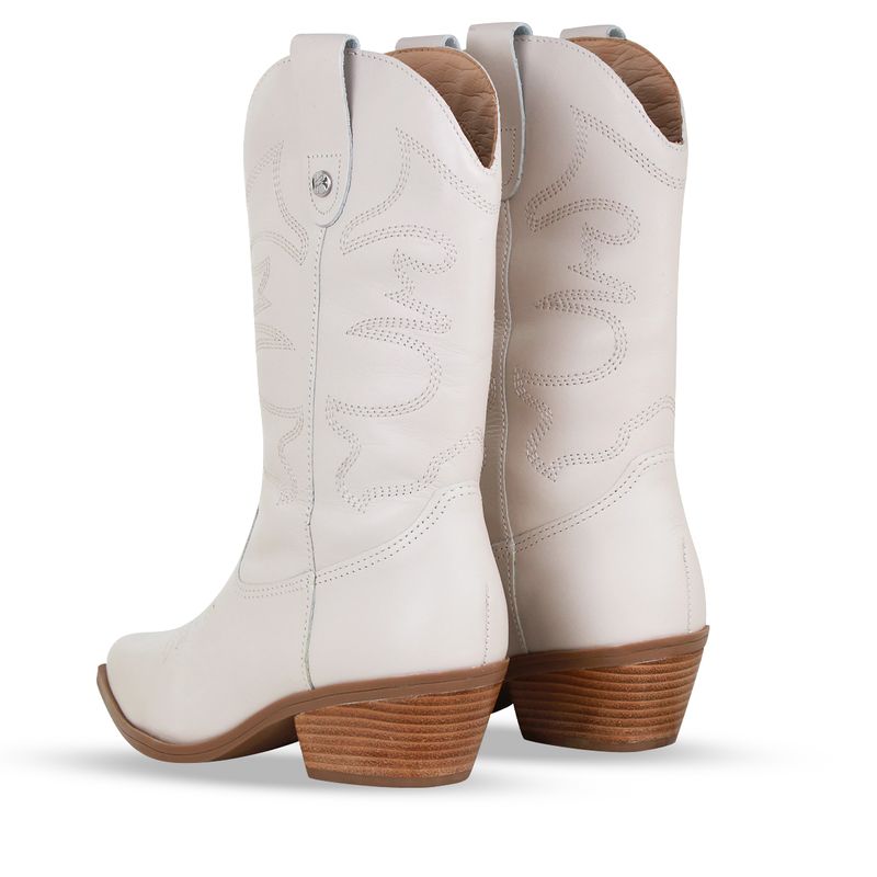 Bota de cano médio estilo western em couro atanado napoli off white. Possui salto baixo e bico fino. Cheia de detalhes em bordado em todo o cabedal. Modelo perfeito para compor looks lindos.