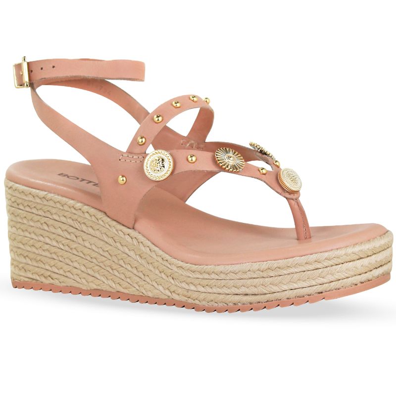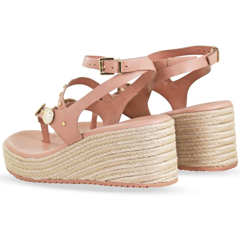 Sandália anabela em couro atanado napoli brown sugar. De salto anabela alto em cordas. Possui traseiro aberto com tira ajustável e fivela de metal dourada. Gáspea com abertura no peito do pé e tira que passa entre os dedos, trazendo firmeza ao caminhar. As tiras da gáspea possuem enfeites dourado.