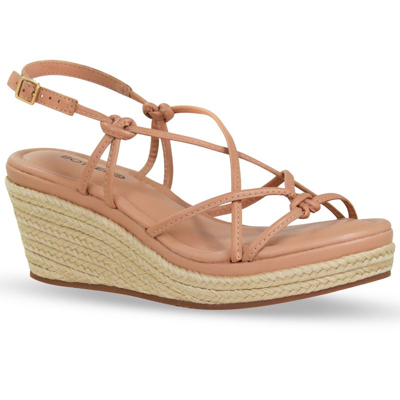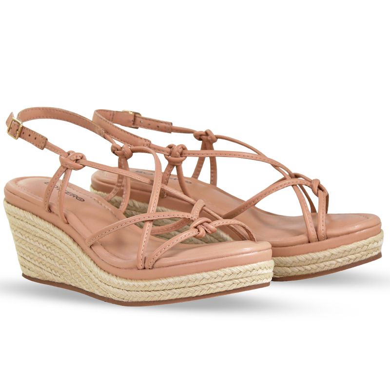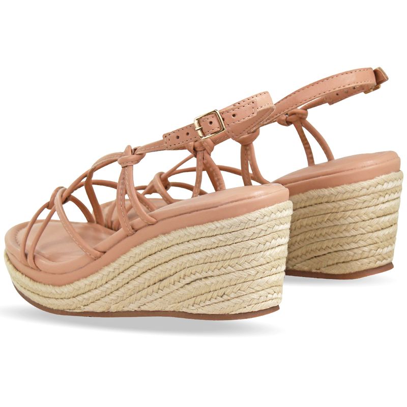 Sandália anabela em couro atanado napoli brown sugar. De salto anabela alto com detalhes em cordas. Possui traseiro aberto com tira ajustável e fivela de metal dourada. Gáspea possui tiras finas transpassadas.