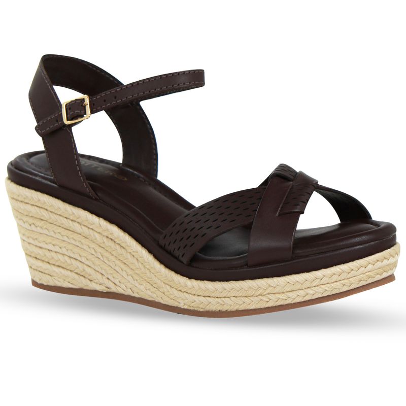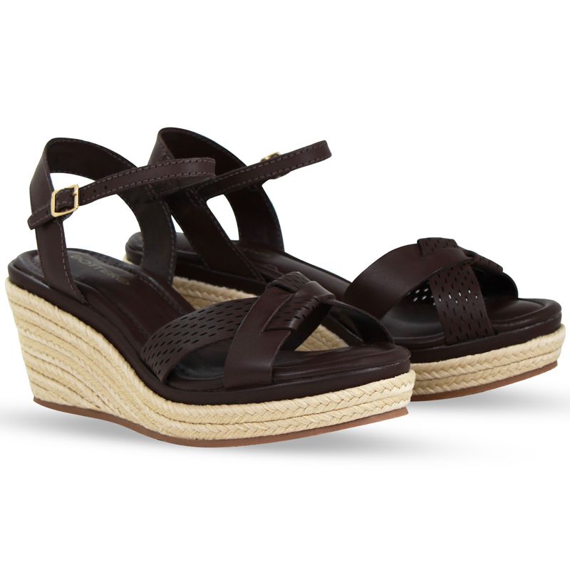 Sandália anabela em couro atanado napoli marrom. De salto anabela alto com detalhes em cordas. Possui traseiro aberto com tira ajustável e fivela de metal dourada. Gáspea possui tiras transpassadas com detalhe a laser.