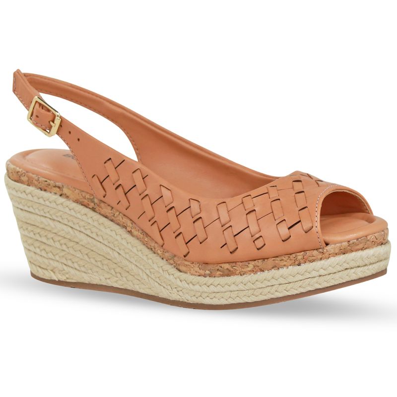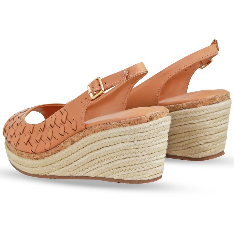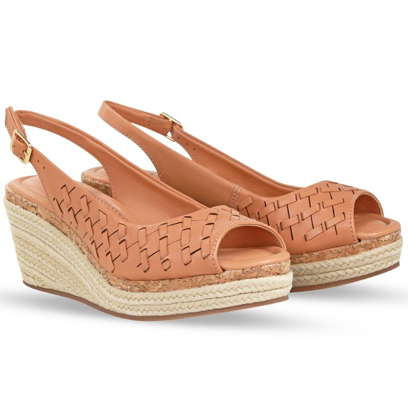 Sandália anabela em couro atanado napoli natural. De salto anabela alto com detalhes em cordas. Possui traseiro aberto com tira ajustável e fivela de metal dourado. Gáspea com detalhes tramados, trazendo charme e delicadeza ao modelo.
