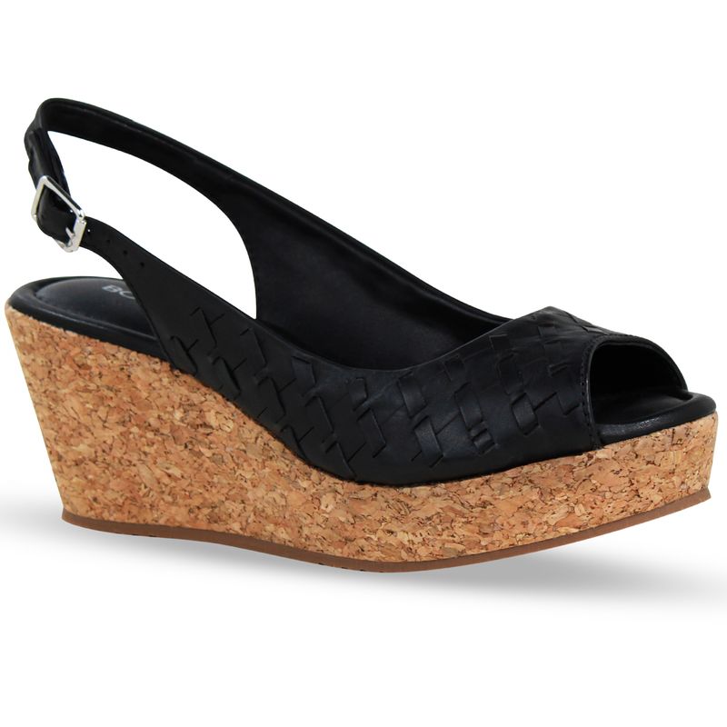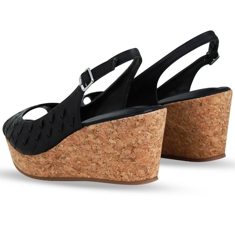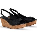 Sandália anabela em couro preto. De salto alto anabela encapado em cortiça. Possui traseiro aberto e tira ajustável com fivela de metal dourada e gáspea com material tramado.