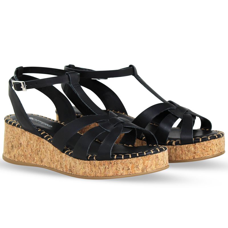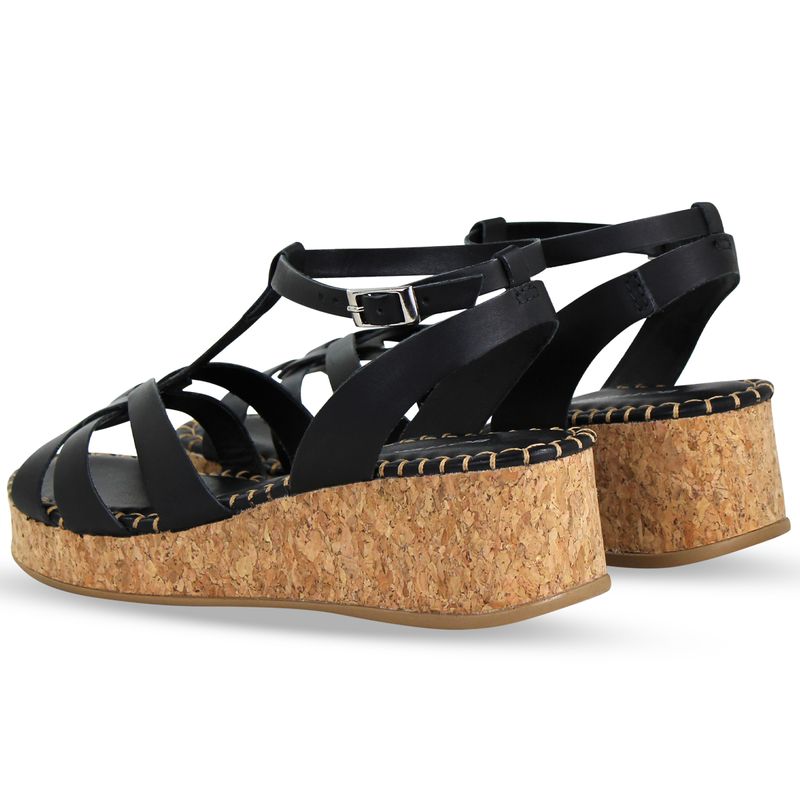 Sandália anabela em couro preto. De solado encapado em cortiça e palmilha com detalhe bordado nas bordas. Possui traseiro aberto com tira ajustável e fivela de metal prata. Gáspea com tiras transpassadas.