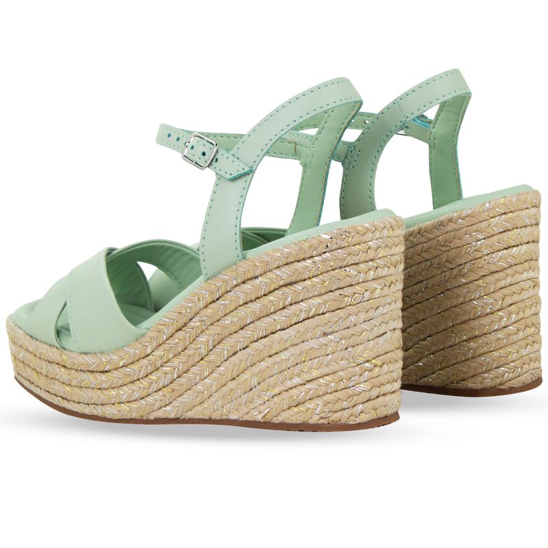 Sandália anabela em couro atanado napoli verde pastel. De salto anabela alto em cordas com detalhes ouro e prata. Possui traseiro aberto com tira ajustável e fivela de metal prata. Gáspea com tiras largas que transpassam sobre o pé.