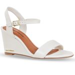 Sandália anabela em couro atenas off white. De salto anabela alto e detalhe com nome da marca no salto. Possui traseiro aberto com tira ajustável e fivela de metal dourada. Gáspea larga.