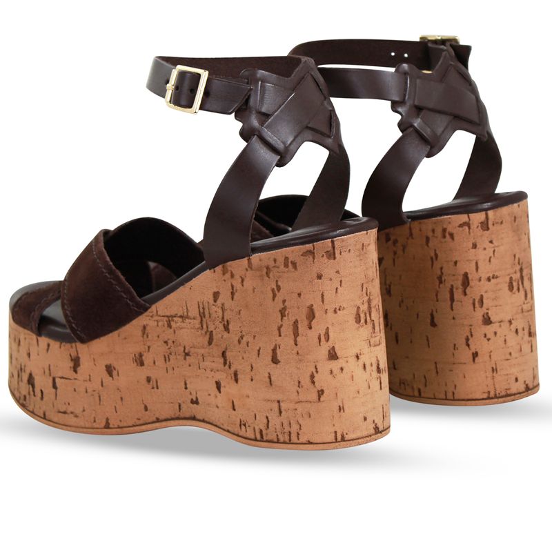 Sandália anabela em couro camurça café. De salto anabela alto com detalhes amadeirado. Possui traseiro aberto com tira ajustável e fivela de metal dourada. Gáspea com tiras transpassadas sobre o pé.