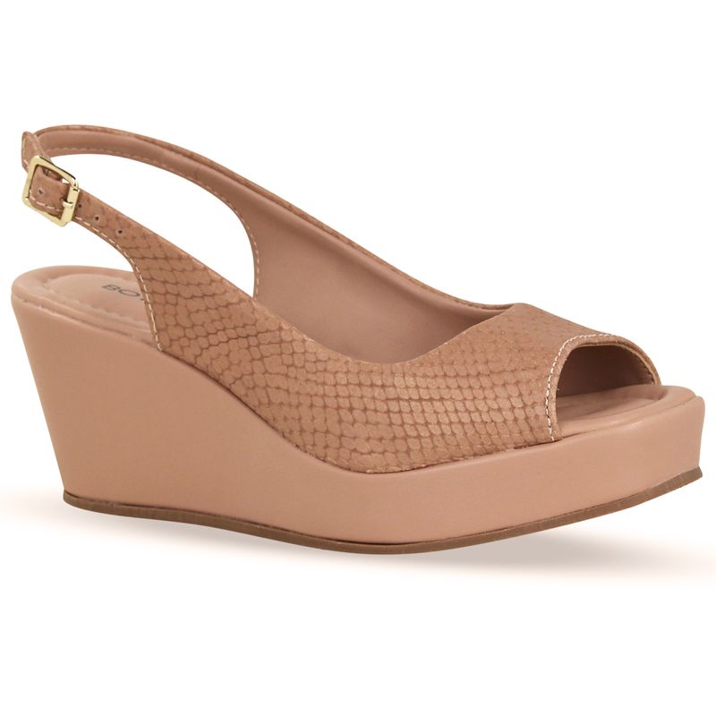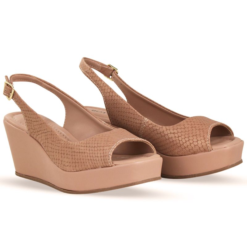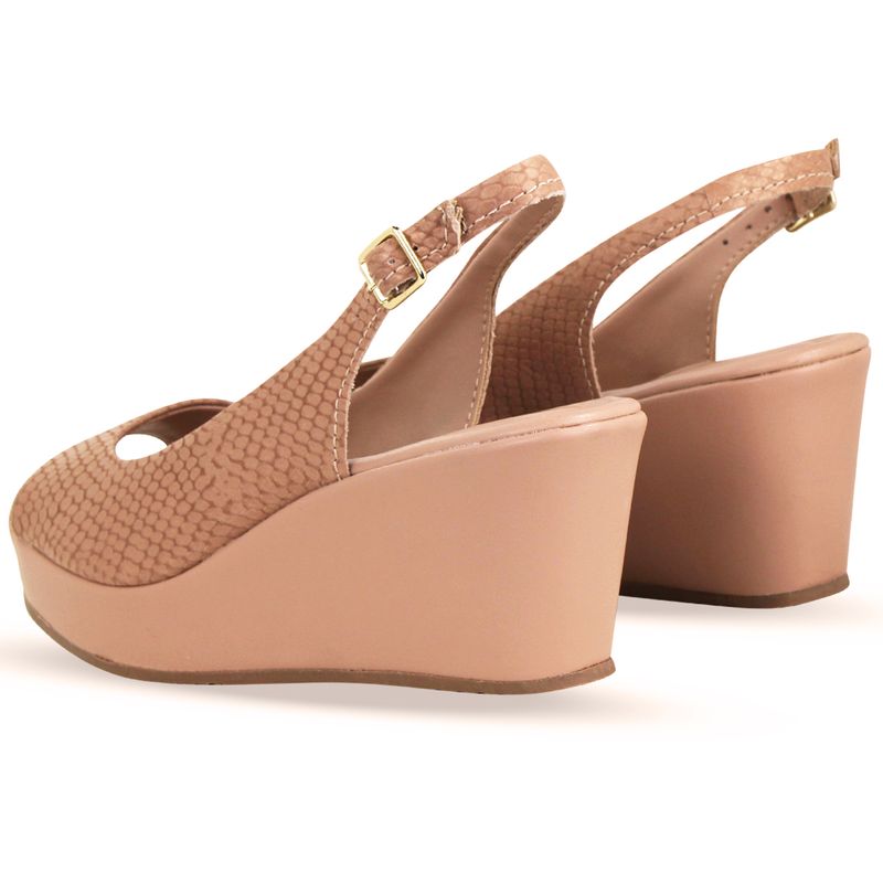 Sandália anabela em couro mamba brown sugar. De salto anabela alto. Possui traseiro aberto com tira ajustável e fivela de metal dourada. Gáspea inteira com abertura nos dedos.