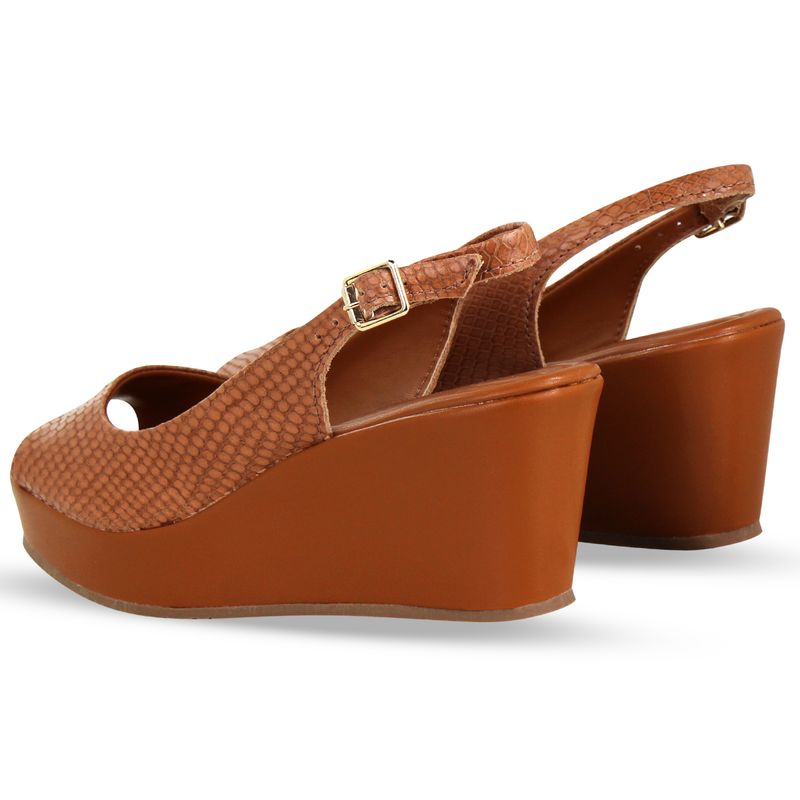 Sandália anabela em couro mamba caramelo. De salto anabela alto. Possui traseiro aberto com tira ajustável e fivela de metal dourada. Gáspea inteira com abertura nos dedos.
