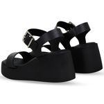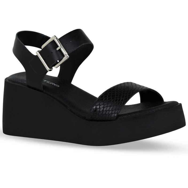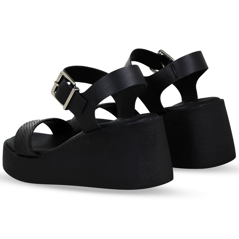 Sandália anabela em couro mamba preto. De salto anabela alto, super leve. Possui traseiro aberto com tira ajustável e fivela de metal dourada. Gáspea inteira.
