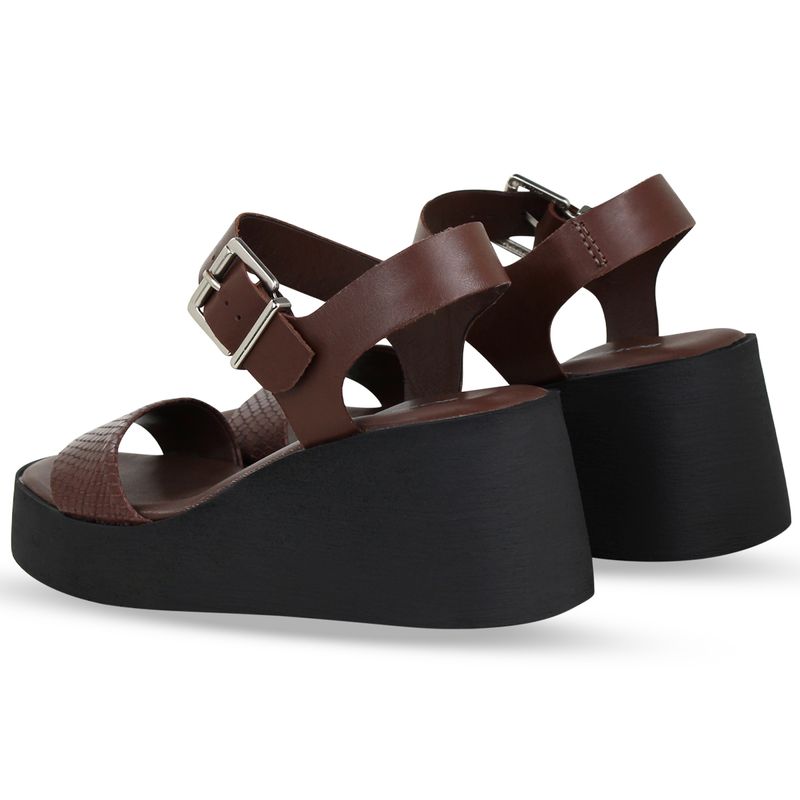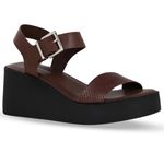 Sandália anabela em couro mamba wood. De salto anabela alto, super leve. Possui traseiro aberto com tira ajustável e fivela de metal dourada. Gáspea inteira.