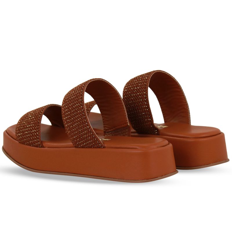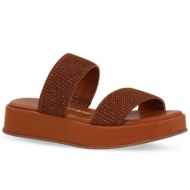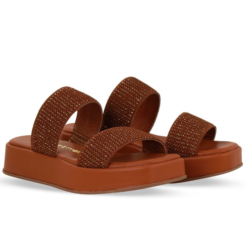 Sandália flatform em couro canela. De solado médio inteiro. Possui tiras em elástico sobre o pé.