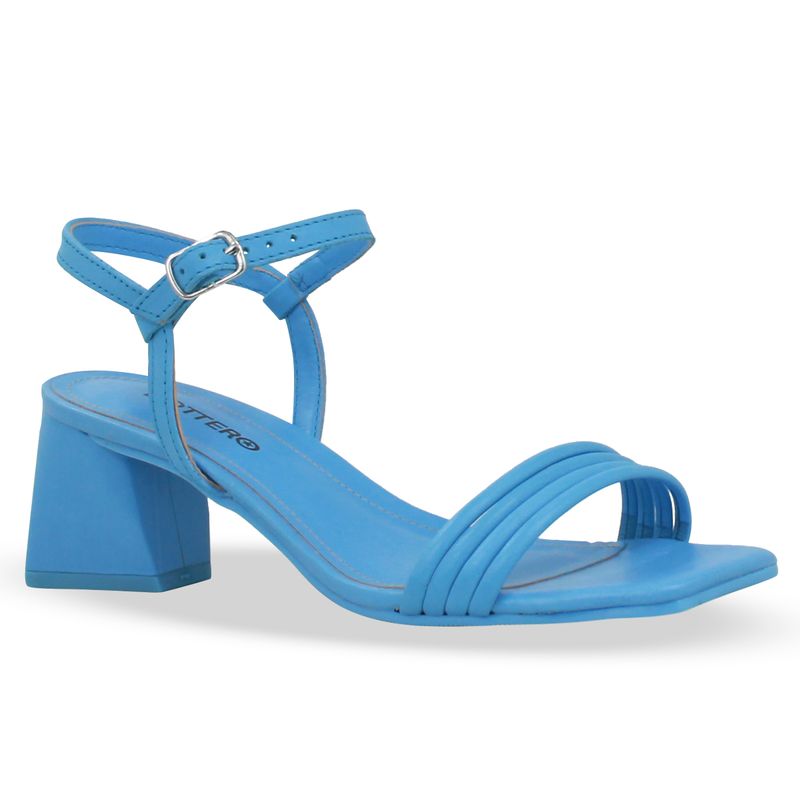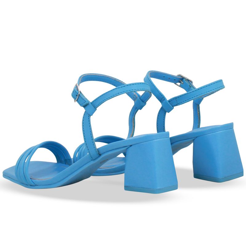 Sandália em couro atanado napoli azul safira. De salto geométrico alto. Traseiro aberto com tira ajustável e fivela de metal dourada. Gáspea em tiras finas.