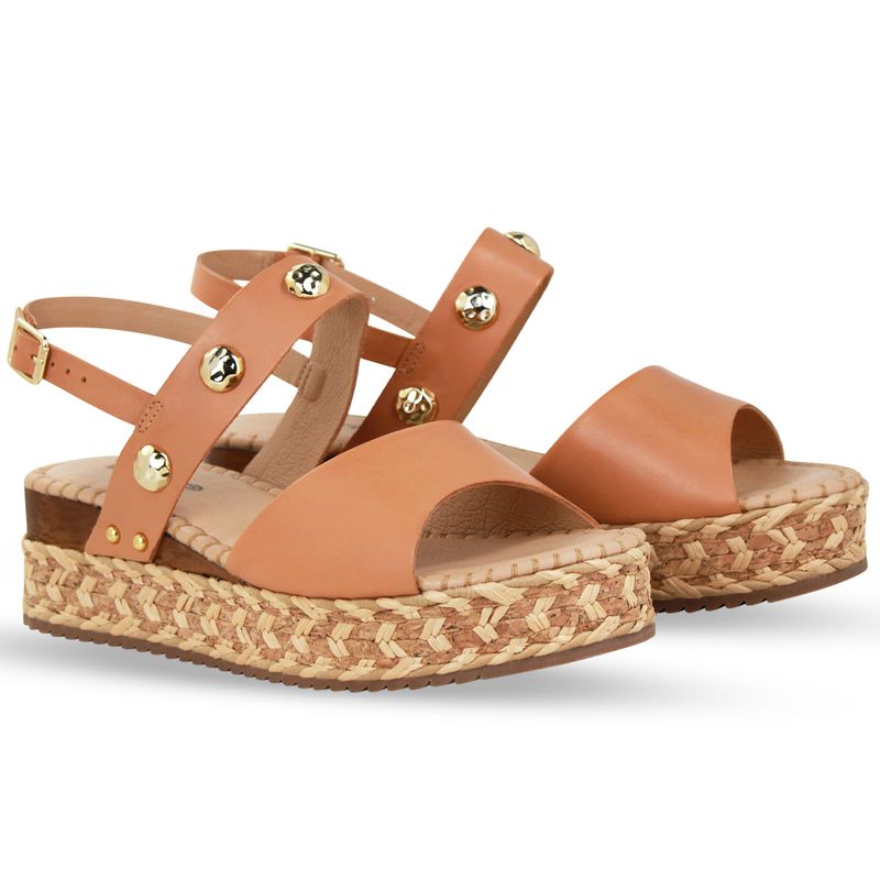 Sandália em couro atanado napoli natural. De salto plataforma alto, com detalhes em cordas e tons de madeira. Possui traseiro aberto com tiras ajustáveis e fivela de metal dourada e gáspea larga. Detalhes em metal dourado.