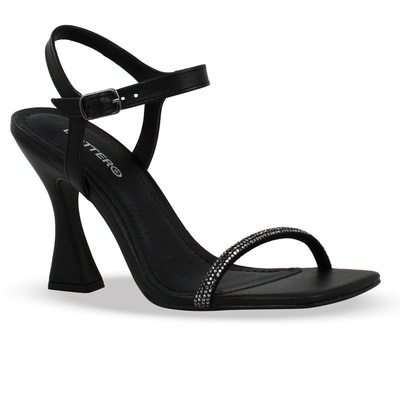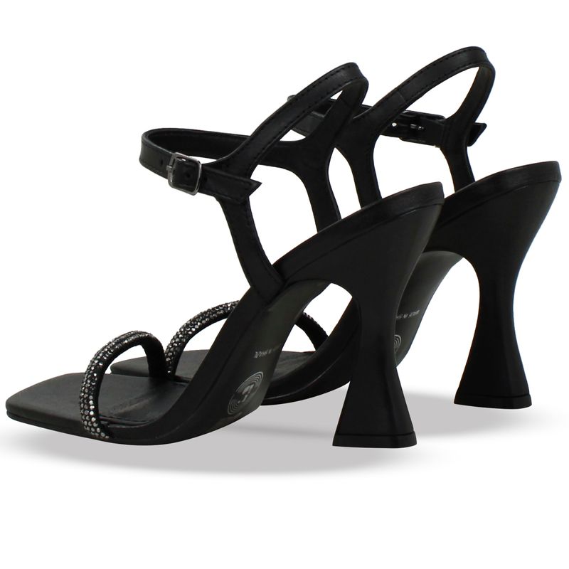Sandália em couro atanado napoli preto. De salto alto ampulheta. Possui traseiro aberto com tira ajustável e fivela de metal onix. Gáspea com tira fina em strass. Cheia de estilo.