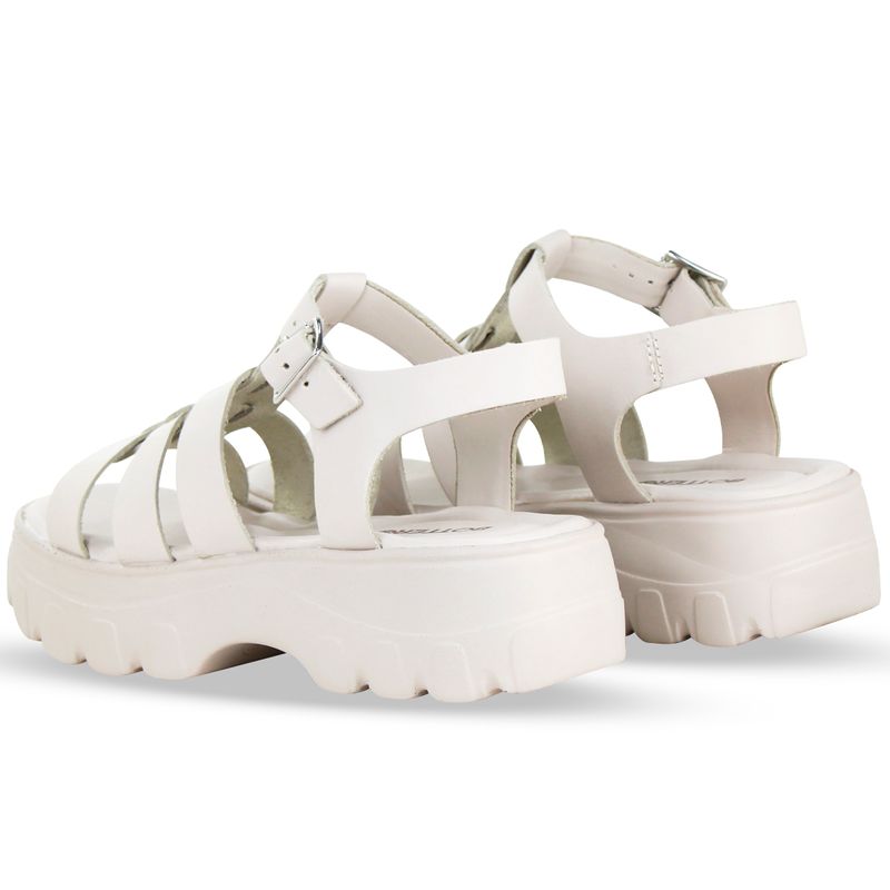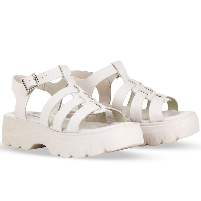 Sandália flatform em couro atanado off white. De solado médio com palmilha macia. Traseiro aberto com tira ajustável e fivela de metal onix. Possui gáspea com tiras finas que transpassam sobre o pé.