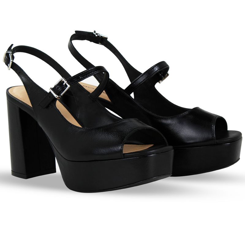 Sandália em couro atenas preto preto. De salto meia pata alto. Possui traseiro aberto com tira ajustável e fivel de metal prata. Gáspea larga com abertura nos dedos.
