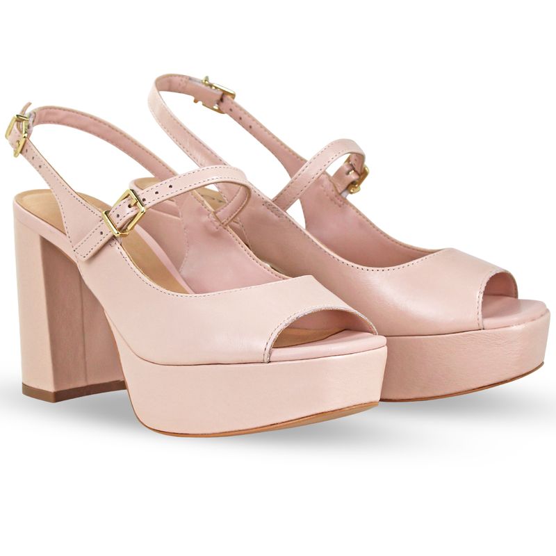Sandália em couro atenas rosa. De salto meia pata alto. Possui traseiro aberto com tira ajustável e fivel de metal prata. Gáspea larga com abertura nos dedos.