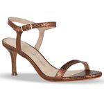 Sandália em couro snake bronze. De salto alto fino. Possui traseiro aberto com tira ajustável e fivela de metal dourada. Gáspea com delicada tira fina sobre o pé.