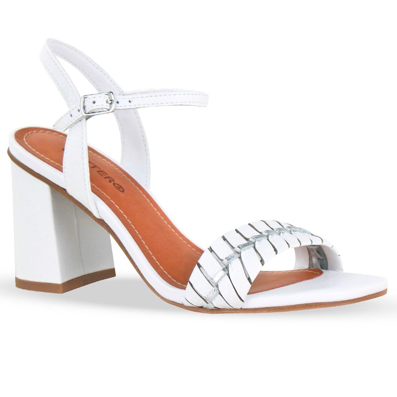Sandália em couro burnish preto. De salto bloco alto encapado. Possui traseiro aberto com tira ajustável e fivela de metal prata. Gáspea com detalhe em couro metalizado roma branco transpassado.